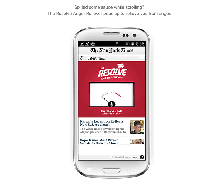 Resolve understands the frustration a stain can cause and it wants to give people a channel to express their anger. So they will place special dispensers in restaurants that allow people to let their anger out when they get a stain.